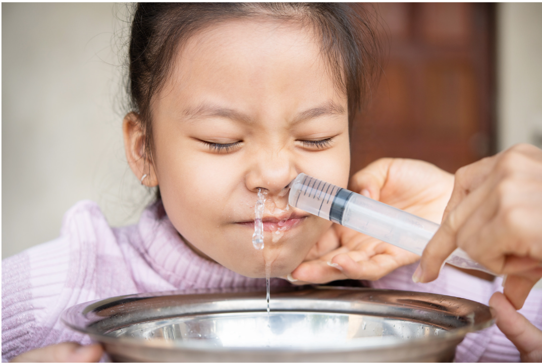 Anak dibantu untuk cuci hidung dengan cairan salin untuk membantu melancarkan pernapasan.